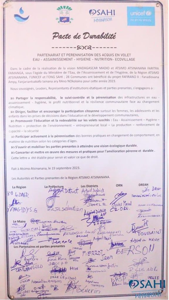 « ATSIMO ATSINANANA, FARITRA FAMANGA » Le lancement du projet FAFIRANO II de l’ONG SAHI en partenariat avec l’UNICEF Madagascar et le Ministère de l’Eau, de l’Assainissement et de l’Hygiène (MEAH) s’est poursuivi le 19/09/23 à Farafangana de la région sud-est. Cet événement a permis de contextualiser le projet de prise en main des services en EAH, nutrition et écovillage par les communautés suivant l’exécution conjointe de « Madagasikara Madio », puis exposer toutes les démarches stratégiques et opérationnelles en termes de renforcement des accès de ses services sociaux et signer par la suite le pacte de durabilité afin d’instaurer une bonne gouvernance locale. Les bénéficiaires s’éparpillent dans 28 communes, 219 fokontany et 1632 villages.