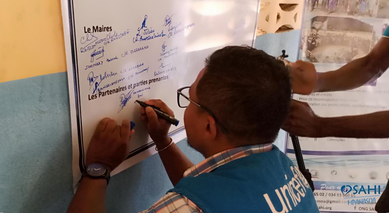 Nos plus vifs remerciements au représentant de la région, aux chefs de districts et chefs d’arrondissement, aux 8 maires des communes bénéficiaires (Marovoay Banlieue, Anosinalainolona, Antanimasaka, Manaratsandry, Ankaboka, Ankazomborona, Tsararano, Ankijabe), au POT Unicef Boeny, aux directeurs régionaux des ministères (DREAH, DRSP, DREN), aux chefs CISCO et à tous les partenaires intervenants d’avoir pleinement participés et signés au pacte de durabilité du projet FAFIRANO II.